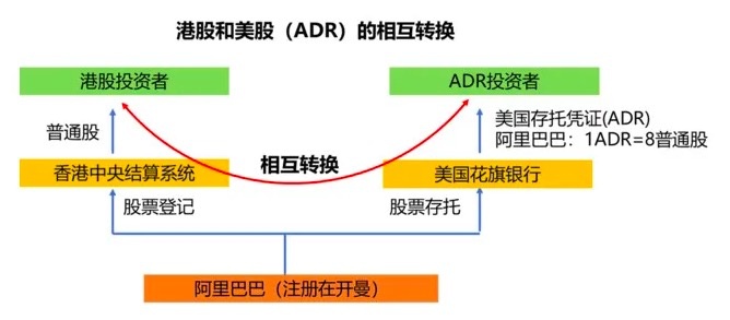 阿里巴巴是一家注册在开曼群岛的公司,注册在开曼主要是出于海外上市、获得外资投资、避税等方面的考虑,大家不用深究。它发行的股票一部分存托在美国的花旗银行,花旗银行以阿里的股票为基础发行了 ADR 供投资者购买, 1ADR=8 普通股,所以说美股投资者买到的其实是这个 ADR,只不过我们平时直接说是阿里的美股。可能有些朋友要问了,为啥要搞个 ADR?这主要是一些法律方面的考虑,大家不用细究。另一部分股票,也就是今年发行的这部分股票,登记在香港的中央结算系统,港股投资者直接可以购买普通股。重点来了,虽然这两部分股票在不同的地方托管和登记,但投资者可以将港股和 ADR 相互转换,当然要通过香港中央结算和美国花旗银行了,也会产生一些手续费,同时需要花费 2 个工作日的时间,手续费和时间都不重要,重要的是能转换。