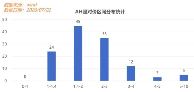 整体来看,124 家 A+H 股份中,所有的 A 股股价都高于 H 股,AH 对价在 1-1.4 的有 24 家,1.4-2 的有 45 家,2-3 的 35 家,3-4 的有 12 家,4-5 的有 3 家,5-10 的竟然有 5 家。
