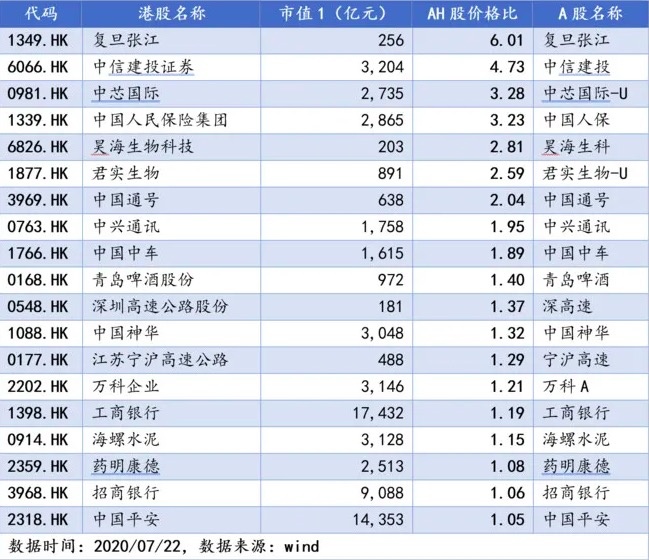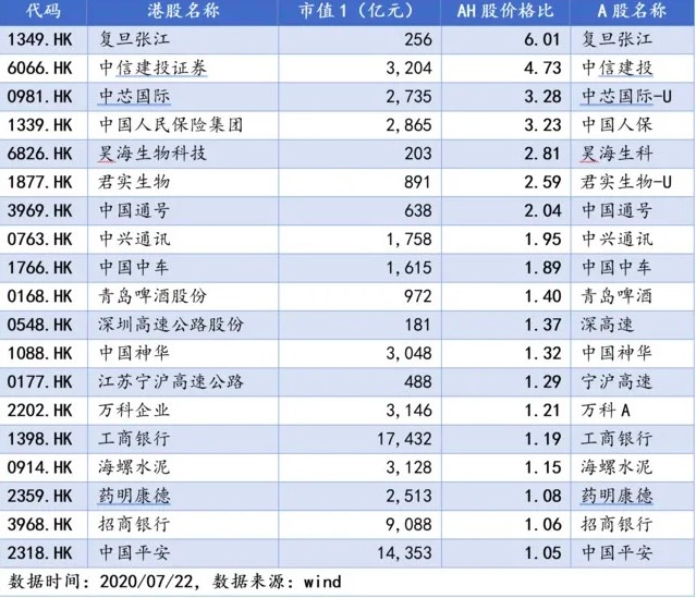 我挑几个 A+H 股简单说一说哈,下面数据都是2020年7月22日的,科创板的复旦张江,这是一家医药行业公司,A 股价格是 H 股的 6 倍。这家公司不是什么新兴公司,2002 年就在港股上市了,资本市场有两大基本功能,资源配置和价值发现,复旦张江在港股价值发现了这么多年也没人重视,一回 A 股,一下子多了众多伯乐,被捧上了天,你说气不气人。然后是中信建投,A 股是港股的 4.7 倍,这是一家头部证券公司,之前传闻是要跟中信证券合并,打造成中国的摩根和高盛,一下子股民群情激奋。军师想说两点,第一,且不说合并之事是否能成,就算两家合并又能怎样,中国 100 多家券商,他们合并了是能垄断市场还是怎样?或者说有协同效应?都是券商,能有啥协同,合并过程保不齐还会有诸多内耗。第二,似乎所有的人都在喊,牛市要买券商。似乎逻辑也很站得住脚:因为券商有四大业务,经纪、投行、自营、资管,牛市交易量大,佣金多,所以经纪业务好;IPO 和增发多,所以投行业务好;同时自营和资管也能挣到钱,这方面收入利润也一定会暴增。逻辑似乎很通,但这里面哪个逻辑带来的业绩能持续?牛市过去了就是漫漫熊市,不太严谨的说,牛市券商暴增的收入可以理解为 “非经常性收入”,一次性的。这样看来港股投资者还是比较理性的。中芯国际,AH 股对价 3.28 倍,又是一只大妖股,这背后涉及到一些大国博弈的因素,被捧得高情有可原,但是如果真的懂集成电路的人都知道,中芯国际的供应链同样不能离开美国,如果美国要制裁,台积电不能给华为代工,中芯国际一样不能,再看看财务指标,军师真心觉得风险很高了,3 个月前港股市值还不到 1000 亿,现在 A 股市值 6000 亿了。中国人保,3.23 倍,这个军师没有太多研究,不知什么原因被推高的,保险也不是什么新兴高科技啊,有个消息大家自己品一品,7 月 9 日社保基金宣布将减持人保的股份,占总股本的 2%,还敢买的股民这真是觉得自己比社保基金聪明啊。可能真的很多买这些股票的股民根本就不知道还有 H 股这回事。这些 AH 股对价数据有超预期么?上面是看的一些溢价比较高的,下面看看哪些公司港股的投资者比较看好,两边价格接近的。我们看看 AH 对价 1.4 倍以下的有哪些,比如青岛啤酒,确实没啥概念可以炒的,深圳高速、宁沪高速,收过路费的,也不性感,还有万科、工行、中国平安之类的,金融股普遍在 A 股不受青睐,但是港股投资者对于这些稳稳的龙头还是很感兴趣的。