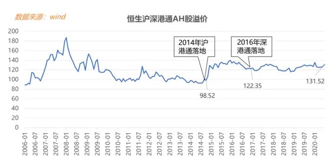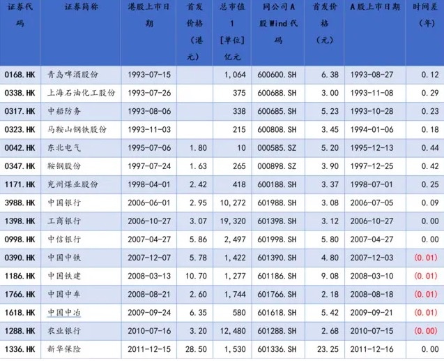 1991 年 6 月港交所成立了中国研究小组,主要研究内地企业香港上市的一些课题,1992 年 2 月完成了一份名叫《有关今后发展方向的中期报告》的报告,这是非公开的,报告主要探讨了内地企业去香港上市的可能性和存在的问题。军师大概看了下,问题真的太多了,那时候中国还没有证券法、会计准则跟国际也不接轨,这些障碍自不用说,那时候甚至中国都没有一部全国性的公司法,外汇、税务、破产等方面也存在一些问题。与此同时,1991 年 12 月,香港有关方面邀请刘鸿儒带队去香港研究国有企业到香港上市的可能性,熟悉中国股市历史的朋友肯定听说过刘鸿儒,后来的第一任证监会主席,而前面提到的聂庆平也是考察团的一员。考察结束后,形成了一份报告,名字叫《关于中国内地企业在香港上市问题的研究报告》,主要分析了利弊,军师认为短短几条利弊分析非常到位,即使现在看来也很有启发性。第一,有利于保持香港的稳定和繁荣。想想那时候的历史背景,再过几年就是香港回归的 1997 年了,香港各方主体自然会担忧香港的未来,这时候中国让一些大型内地企业在香港上市,那无疑是给香港吃了一颗定心丸,具体分析可以参看那篇文章。第二,可以通过香港股市筹集资金。想想当时中国就 200 亿美元外汇储备,中国企业要是想在国外买点先进设备都得盯着这笔钱,这点钱哪够啊?如果能通过香港上市融一笔港币,问题就解决了。第三,有利于内地企业走向国际市场。一是香港上市可以提高企业的知名度,二是可以利用香港完善的市场机制,促进国内企业在企业管理制度和财务制度等方面与国际接轨,算是一种经验学习。当然,也有一些顾虑存在,比如利用香港股市融资,钱是融到了但是没有拿到技术,那时候比较流行的中外合资模式外国企业可是又出钱、又出技术,一站式解决问题,中国只要出市场就行了;另外,企业都去香港上市了,岂不是跟上交所、深交所抢生意,内地的股票市场还发不发展了。但整体来看,利大于弊。1992 年 4 月刘鸿儒向时任国务院副总理的朱镕基进行了汇报,当月港交所主席率团来北京访问并受到了朱镕基的接见,又浇了一把油,这火就点起来了,所以这事就开始推进了,至于前面说到的那些法律、财务、外汇方面的问题,也都在双方专家的努力下得到了解决。1993 年 7 月,青岛啤酒(0168,H 股)股票在香港交易所上市。同年 8 月,青岛啤酒(600600,A 股)在上海证券交易所上市,成为了中国首家在两地同时上市的公司,当时 A 股的发行的价格就是 H 股发行价的 2 倍多一点,这 AH 股价差从一开始就存在。后来 2000 年前后被称为石化双雄的中石油、中石化发行了 H 股,2003-2006 年集中上了一批巨无霸金融股,包括中国人寿、中国平安、工商银行、建设银行等等。值得一提的是,除了上面说到的几个原因,这些大块头在香港上市,也是因为那时候的内地的资本市场还太小,承受不了这些大块头。下面一个重点知识又来了,高能预警。截至 2020 年 7 月,据 wind 统计,合计有 124 家 A+H 股票,如果把 A 股和 H 股上市日期相差半年以内的定义为 A+H 同时上市,我们可以看到,2000 以前的发行基本都是港股发行价远低于 A 股发行价,2000 年以后以几家大银行为代表的发行,A 股和港股发行价就是相同的了,有很多学者认为这是 A 股夺回了定价权的标志。
