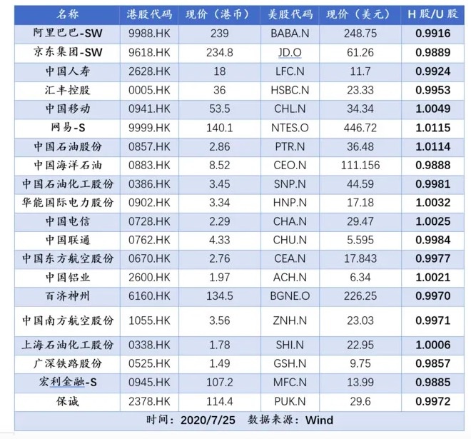 在解释为什么互联互通之后 AH 股价差没有缩小的原因之前,军师先给大家看看港美股价差便于大家后续理解。除了有在 A 股和 H 股两地上市的公司以外,还有在港股和美股两地上市的公司,比如中国移动、中国电信,还有最近刚上港股的阿里巴巴、京东、网易等;另外还有中国石油、中国人寿等 A 股 + 港股 + 美股三地上市的公司,那么港股和美股有价差么?不卖关子了,答案是几乎没有。军师整理了 7 月 25 日的港美股价差,我们看到价差最高的也没有超过 2%。
