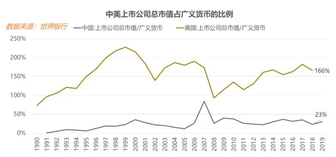为什么差异这么大呢?是因为中国滥发货币收割老百姓么?其实不是,这跟中美的企业融资结构相关,中国是间接融资为主,美国是直接融资为主,简单说,中国企业需要钱了,主要是靠银行贷款来间接融资,而美国企业需要钱了,主要是发行股票和债券直接融资。关于货币总量和 GDP、通货膨胀、融资结构等方面的关系是挺复杂的,军师硕士毕业论文研究的就是这个。言归正传,军师用上市公司总市值占 GDP 的比例除以广义货币占 GDP 的比例,就能得到总市值占广义货币的比例,也就是股票数量和资金数量的相对比例,2018 年中国是 23%、美国是 166%。