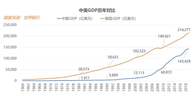 你一定听到过一句话,就是中国 “人傻钱多”,比较专业的人会说中国 “资金沉淀多,投资渠道少”,军师在 “零和博弈” 那期视频讲过,股价在交易层面就是资金数量和股票数量这对供需关系的反应,今天军师展开讲一下所谓的 “人傻钱多”。美国钱也多,但是为什么没人说美国人傻钱多呢,因为钱多不多都是相对的,要看跟投资渠道比多不多。一般来说,普通居民的投资渠道无非是存款债券、股票基金、房产,在中国房产 98 年商品房改革以后才能算得上一个投资品,股票基金在很长时间里相对中国经济体量来说都很小,所以很长时间内中国居民的主流渠道也就是存款债券,我们的父母这一辈还比较喜欢买国库券,收益率普遍是比较低的,但客观上也算是居民部门支持企业部门发展了,跟建国初期农业部门支持工业部门逻辑类似,总有人要吃点亏。下面我们与美国进行对比,用数据来说明下中国股票这种资产的相对短缺性。为了保证数据可比,我们都用世界银行的统计口径,单位都换算成美元。先看一下中美 GDP,这张图可能大家比较熟悉了,60 年里中国 GDP 已经说不清翻了多少翻了,1990 年中国还不到美国一个零头, 2000 年中国达到 1.2 万亿美元, 2010 年中国接近美国的 1/2,2019 年中国已经达到美国的将近 70%,达到了 14 万亿美元。