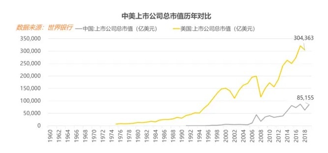 下面我们看看世界银行统计的两国上市公司总市值(不包括在美国上市的非美国企业),这个指标可以近似理解为股票这种投资品的总量,当然美国因为资本账户是开放的,所以美国人是可以投资全球股票的,这里仅用这个指标做一个中美差异的直观对比,我们看到差距还是很大的,美国上市公司市值 30 多万亿美元,中国 8 万多亿美元。