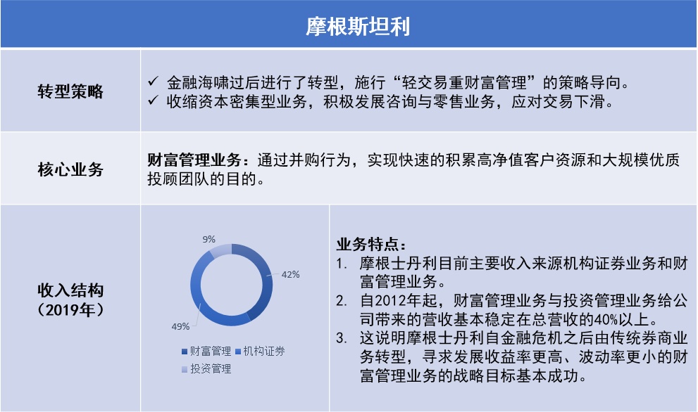 以摩根斯坦利为典型代表的国际投行将战略重心上从以交易和投行为主的机构业务向财富管理、投资管理为主的资管类业务转移。施行“轻交易重财富管理”的策略导向。收缩资本密集型业务,积极发展咨询与零售业务,应对交易下滑。