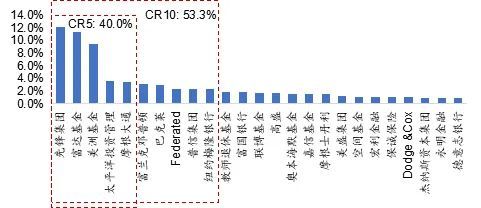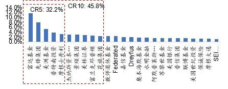 行业集中度重新回升,CR5和CR10分别由2000年32.2%、45.8%增至40.0%、53.3%,行业头部效应显著,管理规模排名前三的投资管理公司先锋集团、富达基金、美洲基金市占率分别为12.1%、11.3%、9.4%,显著高于其他基金。