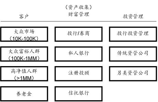 泛财富管理行业生态圈由三部分组成,分别为投资管理、财富管理、终端客户,其中投资管理机构创设产品、募集资金,主要有投行投资管理部门和专注型投资管理公司,财富管理机构作为渠道帮助资管机构销售产品,主要由投行、折扣券商、私人银行、注册投顾(RIAs)、信托银行等组成。