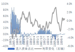 国债收益率走低带动资金流入债券基金,1985年1月-1987年3月、1990年9月-1994年1月,3年期国债收益率处于下行周期,平均每月带动资金净流入分别占总资产5.8%、1.2%;