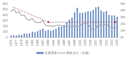 1975-1990:交易佣金在证券行业总收入的占比下滑,由佣金率自由化前的平均占比超40%降至1990年不足总收入的17%;