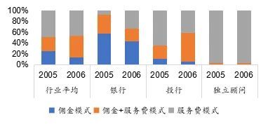 到2009年以后,投行的资管能力逐步减弱,而金融危机之后,财富管理的分化也不断加剧。雷曼兄弟破产,美林被美国银行收购,贝尔斯登被摩根大通收购,高盛和摩根士丹利转为银行控股公司,行业格局重塑,独立投行向全能银行转变。财富管理服务客户的方式更加多元化,商业模式由卖方佣金模式向买方服务费模式迁移,根据摩根士丹利奥纬咨询测算,行业采用服务费模式或佣金+服务费模式的比重由2005年74.1%增至2005年86.9%。