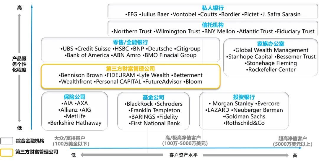 中小投行/注册投顾(RIAs)主要服务富裕人群,向客户提供投顾服务,一般而言,其收入以客户服务费为主,不向客户收取买卖佣金或申购赎回费用,最大程度上减少利益冲突;