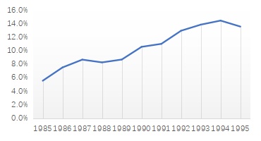 1975-1989年是美国证券行业高速发展的十五年,营收大幅增长,行业总营收由70.1亿美元增至746.4亿美元,占美国GDP的比重由0.42%增至1.32%。