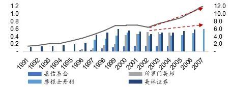 摩根士丹利、美林证券投资管理规模2002-2006年分别增长42.1%、28.4%,低于同期行业管理规模增长62.7%。