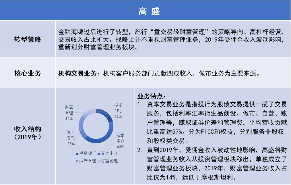 ▶ 机构交易导向的型投行 2009年金融危机后,高盛以其机构业务优势为禀赋,继续大力发展机构交易业务,战略上并不重视财富管理业务,在业务板划分中,将财富管理业务并入投资管理业务。