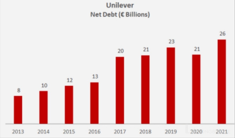 图 3:联合利华自 2013 年以来的净债务(基于公司 2013 年至 2021 年的年报)