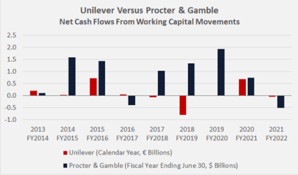 图 1:2013 年至 2021 年(联合利华)以及 2014 财年和 2022 财年(宝洁)的营运资本流动产生的净现金流量(基于两家公司过去九年的现金流量表)
