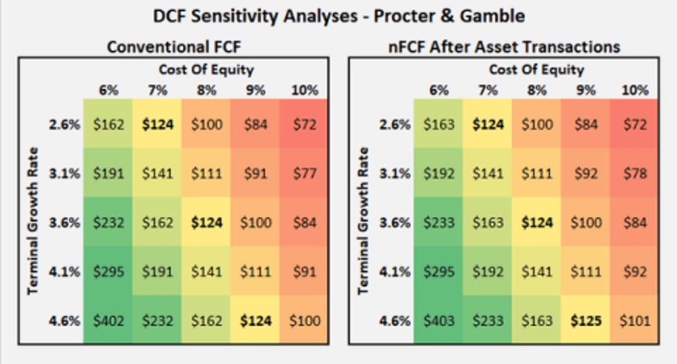 由于营运资金变动、基于股份的补偿费用和收购的影响几乎可以忽略不计,宝洁公司的敏感性分析在调整时没有发生重大变化包括。以 8% 的股本成本计算,宝洁预计需要以 3.6% 的终端增长率增加其 nFCF,以证明其目前 124 美元的股价是合理的。