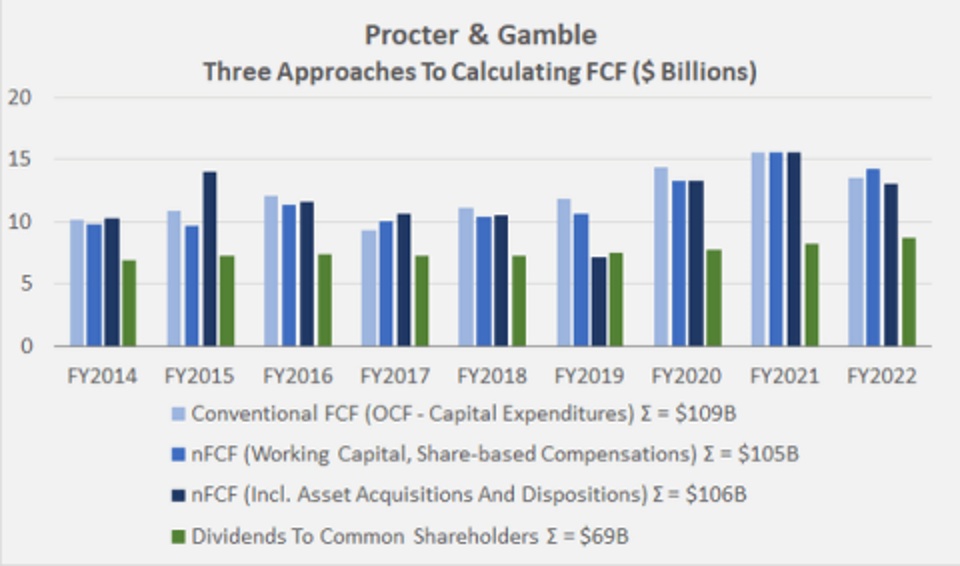 图 5:计算宝洁公司自由现金流的三种方法(自己的工作,基于公司 2014 财年至 2022 财年的 10-Ks)