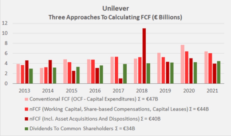 图 4:计算联合利华自由现金流的三种方法(基于公司 2013 年至 2021 年的年度报告)