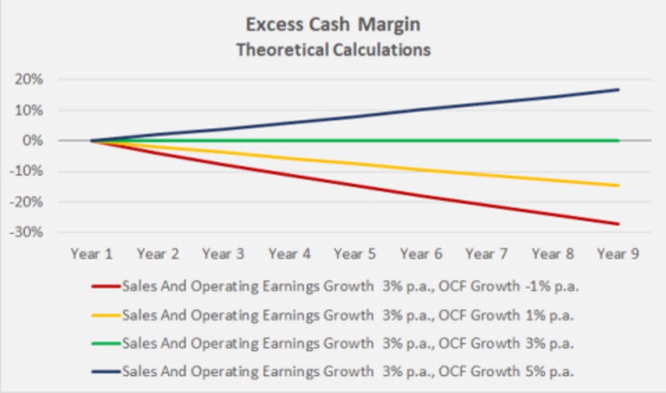 对于那些对现金流和收益取证感兴趣以发现潜在收益问题或会计欺诈的人,分析师想简要介绍一下超额现金保证金 (ECM)。这是衡量营业收入和 OCF 的相对增长率的指标。ECM 可以通过从相应的经营现金流量中减去每年的经营利润并除以当年的销售额来计算。