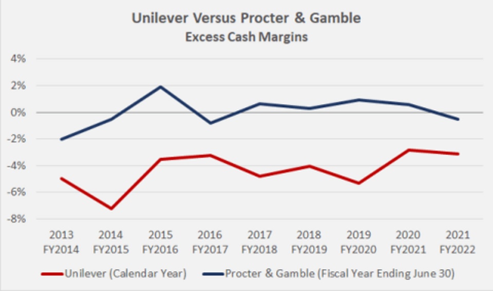 图 9:联合利华和宝洁的超额现金保证金轨迹;营业收入针对减值和重组费用进行了调整,营业现金流量针对基于股份的补偿进行了调整,并根据营运资金流动进行了标准化(基于两家公司过去九年的现金流量表)