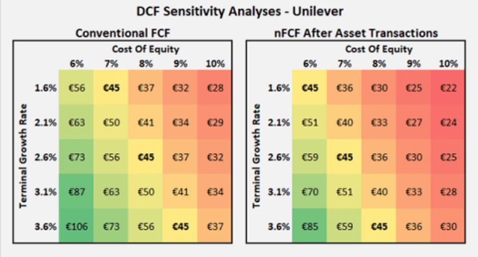 一旦确定了标准化的自由现金流,就可以轻松分析调整对贴现现金流 (DCF) 计算的影响。图 6 和图 7 分别显示了联合利华和宝洁的 DCF 敏感性分析。两个图中的左图是使用传统确定的 FCF 的三年平均值计算的,而右图是使用资产收购和处置后的 nFCF 计算的。