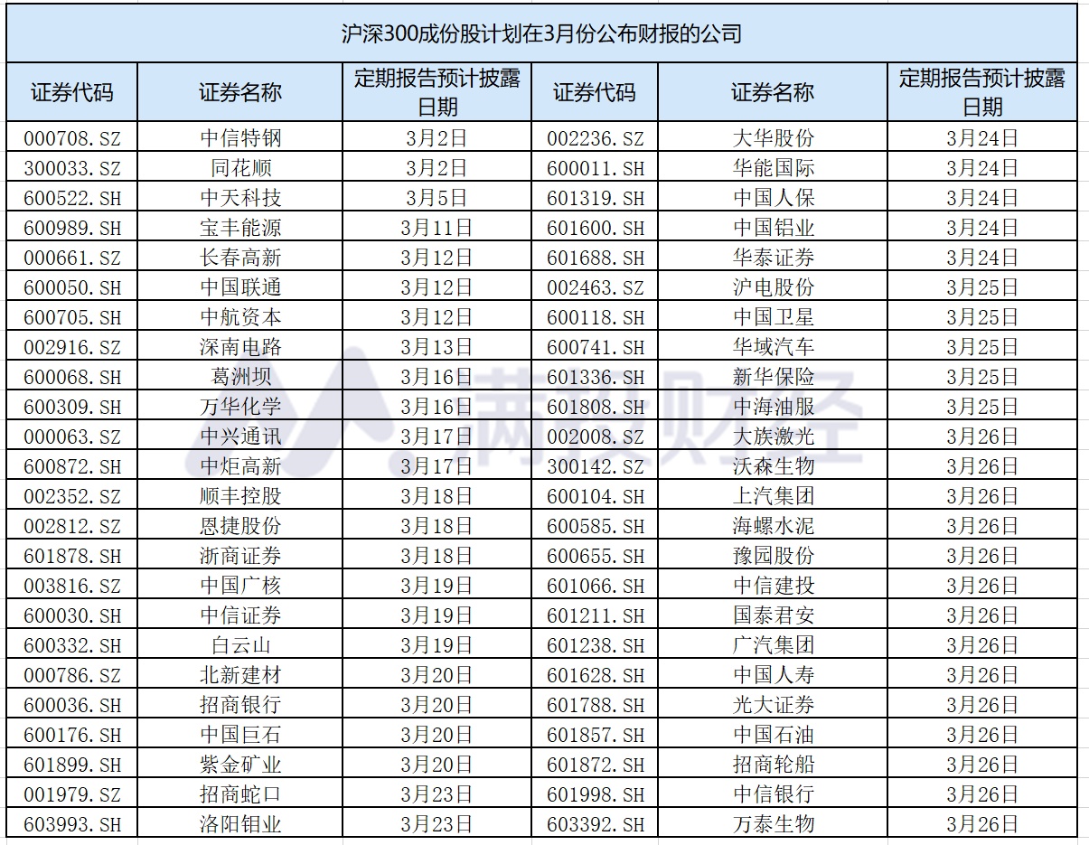 A 股财报披露时间是有严格的规定,像年报要求在每年 1 月 1 日——4 月 30 日之间公布,若迟发研报轻则通报批评,重则摘牌退市,因此在每年这时间被称为 A 股的财报季。还有一个重要日期,就是定期报告预计披露时间,也就是公司的审计结束可以公布财报的时间,这是一个重要日期。到了预计披露日期的这一天上市公司就要公布新的财报。下图是沪深 300 三月份财报的公布预计披露日期,小伙伴们可以收藏好了。