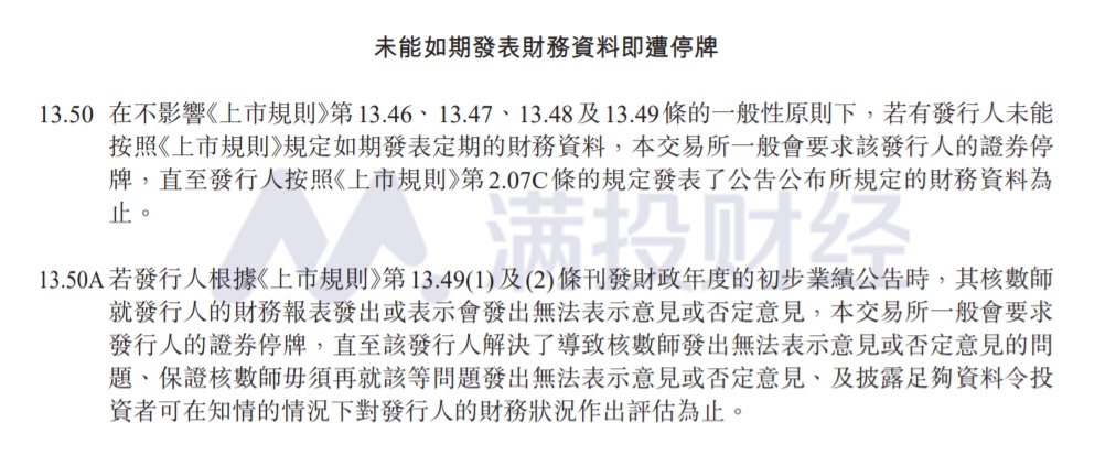 如果未能如期发布上述财务资料,上市公司将面临停牌,后果还是挺严重的。规定要求:在不影响《上市规则》第 13.46、13.47、13.48 及 13.49 条的一般性原则下,若有发行人未能按照《上市规则》规定如期发表定期的财务资料,本交易所一般会要求该发行人的证券停牌,直至发行人按照《上市规则》第 2.07C 条的规定发表了公告公布所规定的财务资料为止。