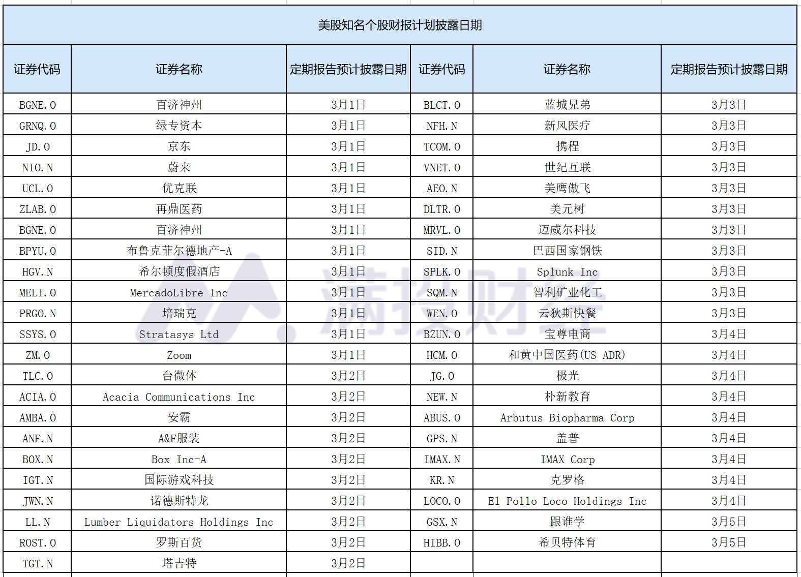 下面是知名美股企业在三月份公布的报表预披露日期: