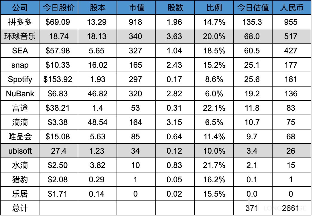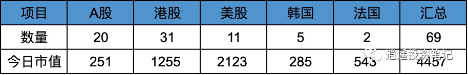 腾讯整体持有的上市公司数量为 69 家,持仓市值折合人民币 4457 亿。腾讯 Q1 财报披露的上市公司公允值为 4728 亿。本文统计的应该覆盖了大部分腾讯投资的上市公司。如有遗漏,欢迎大家私信补充。