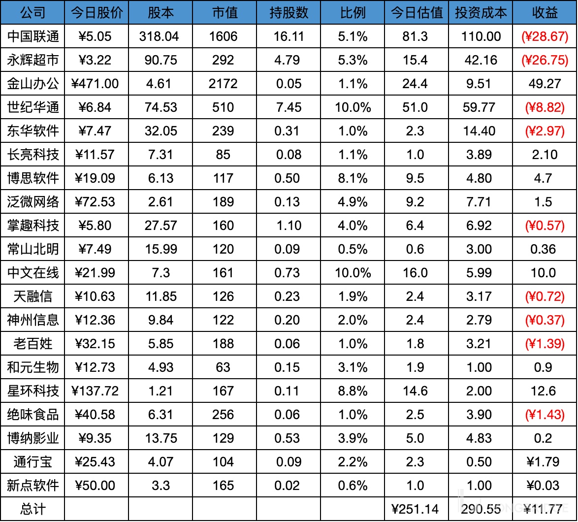 A 股目前持有 20 家公司,目前持仓市值 251 亿人民币,累计投资金额 291 亿人民币,累计盈利 12 亿人民币。