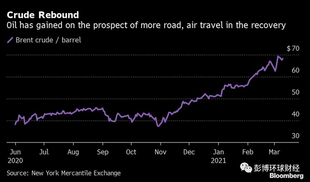 能源:经济复苏、出行增加带来更强劲需求,加之产油国决定限制产量,推动油价升向每桶 70 美元,是近两年来最高水平。