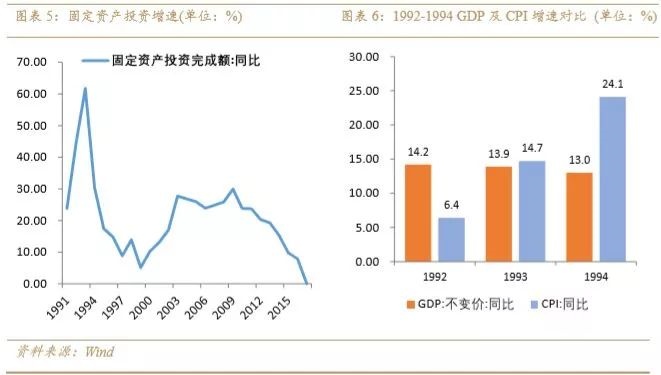2、1993-1994 年。1992 年改革开放背景下,固定投资增速快速上行,于 93 年达到高点后增速转而下行,叠加放开商品价格、市场供求决定下,物价快速上行。