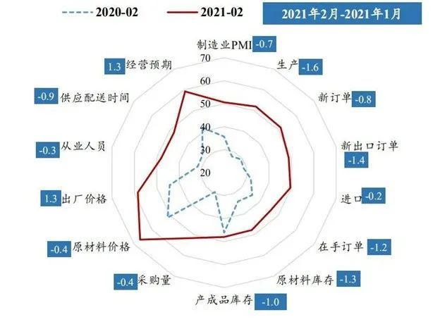 2 月制造业 PMI 主要原材料购进价格指数和出厂价格指数分别为 66.7% 和 58.5%,较上月变动-0.4 和 1.3 个百分点,高位运行。从行业情况看,石油加工煤炭及其他燃料加工、黑色金属冶炼及压延加工、有色金属冶炼及压延加工、电气机械器材等行业主要原材料购进价格指数均超过 70.0%。