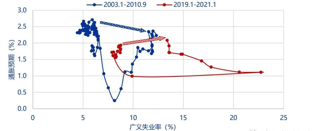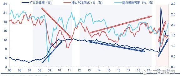 按照菲利普斯曲线,通胀预期已经升至 2018 年的水平了,这对应着较好的需求前景,失业率也应该已经降至低位,但现实情况与之相悖,通胀和就业出现了结构性的错位。