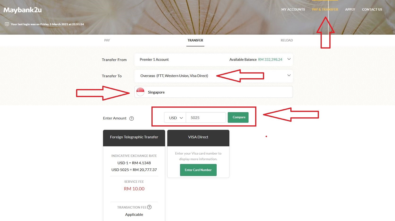 5)打开你的银行平台,在上面点击 pay & transfer,然后选择 Overseas (FTT),然后就选择新加坡,过后输入你打算如今的数目,他可以给你选择如今马币还是美元的,为了方便可以直接选美元,然后按 compare 就完成了。