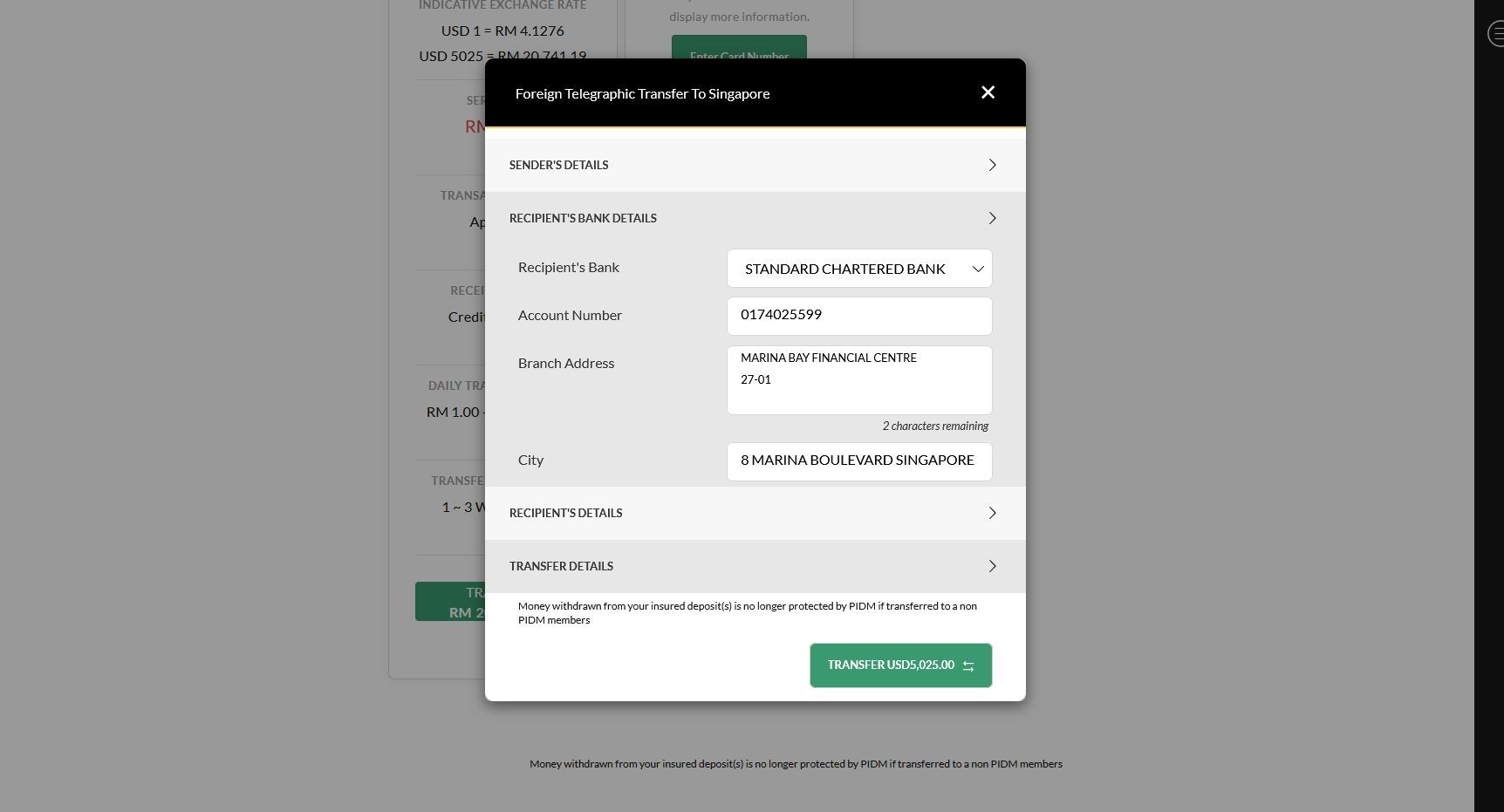 9)就是这么简单,转账据完成啦,然后就在长桥上传这个收据即可,为何会转 5025 呢?因为根据朋友的说法,这个转账会征收 25 美元的费用,所以进 5025 就刚好 5000 了,但是我这次的转账只有 4995 而已,不知道是不是上面 sender bear the fee 选错了还是 5000 以上是 30 块,记得大众银行是选共同承担那个费用的,应该是这里按错了,下次再试试看如何。。