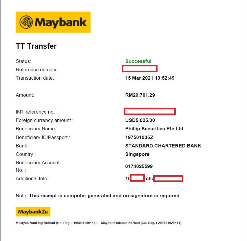用 MBB 转账比用大众银行转账 user friendly 很多,之前大众银行的工作人员会要求我提供长桥的一些信息,但是 MBB 完全就没这些要求,确实比大众方便很多,然后费用上,大众我是选共同承担,所以他的转账费用是 rm15(服务费)+18usd 的过境费用(新加坡银行收),而马银行则是 rm10(服务费)+25usd 的过境费用(新加坡银行收),但是马银行则可以一次过转账 5 万马币左右,大众只能一万,所以如果转大笔一点的,马银行会比较方便。