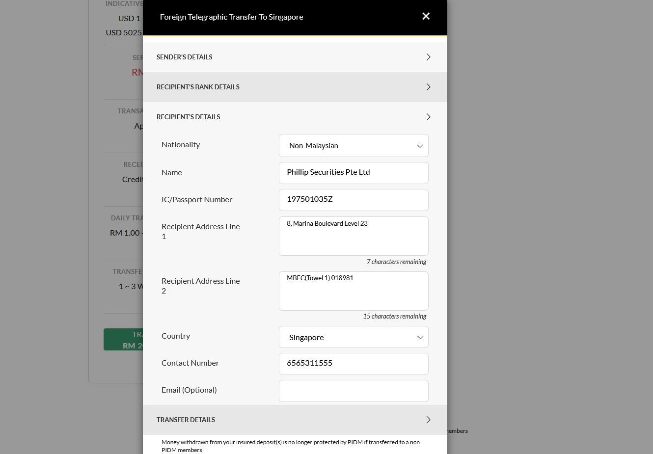 7)一打开显示的是个人资料(sender details),那个基本上是注册银行户口时有的,所以无需管他,直接点击 recipient bank details 和 recipients details 输入如上图的 Phillip securities 的公司资料,就可以了。