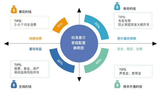 标准普尔曾调研全球十万个资产稳健增长的家庭,分析总结他们的家庭理财方式,从而得到标准普尔家庭资产象限图,它将家庭资产分成四个账户。