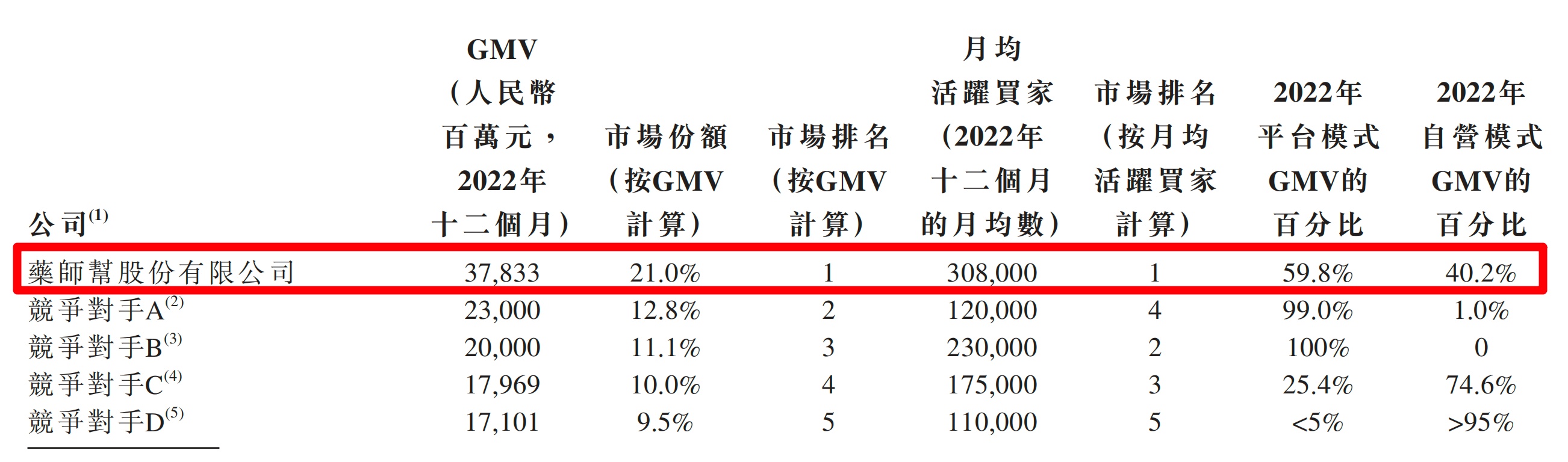 根据弗若斯特沙利文的资料,2022 年药师帮总 GMV 已经达到了 378 亿元,最近 3 年的年复合增长率为 38.6%,这两项数据在中国院外数字化医药产业服务平台排名第一。截至目前,药师帮已经覆盖 35.4 万家药店以及 17.3 万家基层医疗机构,月平均活跃用户已到 30.8 万个,是国内当之无愧的最大的数字化医药交易与服务网络平台。