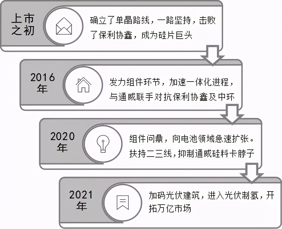 其在发展之初,确立了单晶路线之后,一路坚持,击败了保利协鑫,成为光伏巨头。