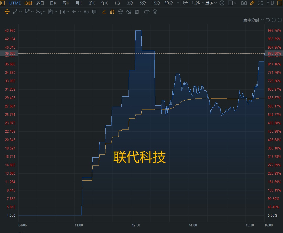 低成本手机及配件制造商联代科技 (UTME) 昨晚成功登陆纳斯达克,上市首日盘中暴涨 1050%,多次熔断,最终收于 875%,一夜之间翻了 8 倍,创下了 1999 年以来的新股记录,今天盘前又是接近 50% 的涨幅。
