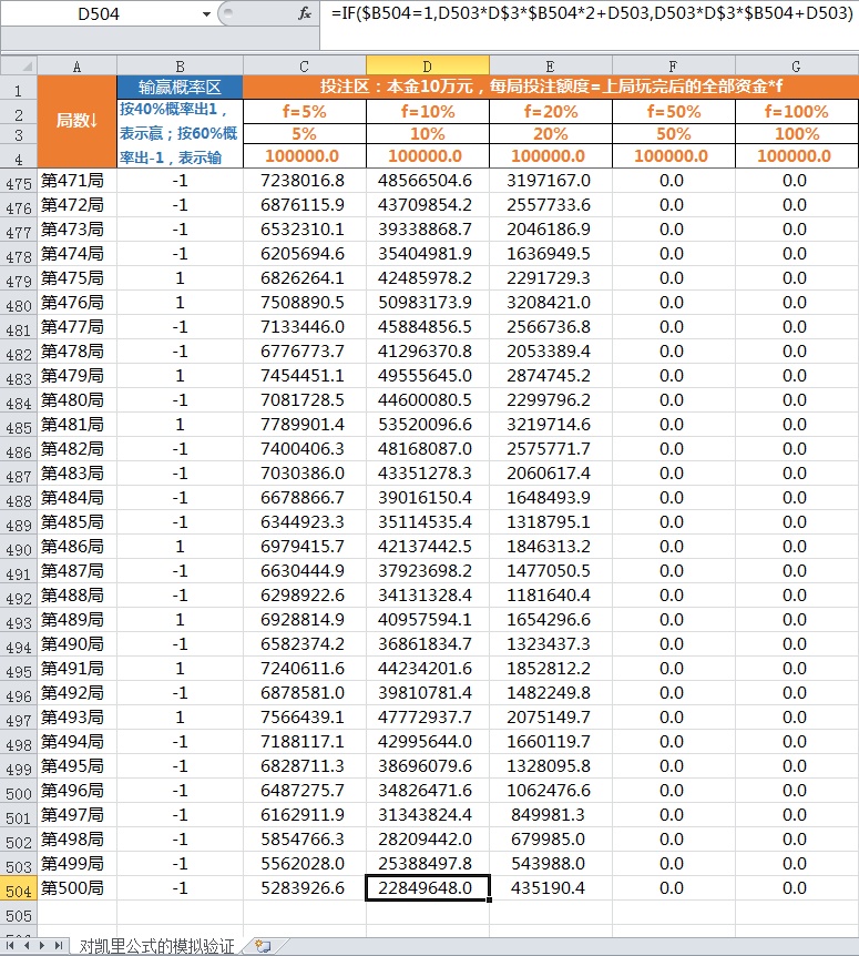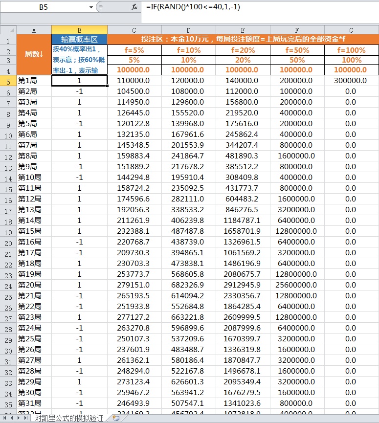 A 列为玩赌局的局数。B 列为输赢概率区,用 Excel 的随机函数 RAND,按 40% 概率出 “1”,表示赌局 “赢”;按 60% 概率出 “-1”,表示赌局 “输”。C 到 G 列为下注区,表示每次分别拿出手上全部资金比例的 5%、10%、20%、50% 和 100%,投注到下一次的赌局中。