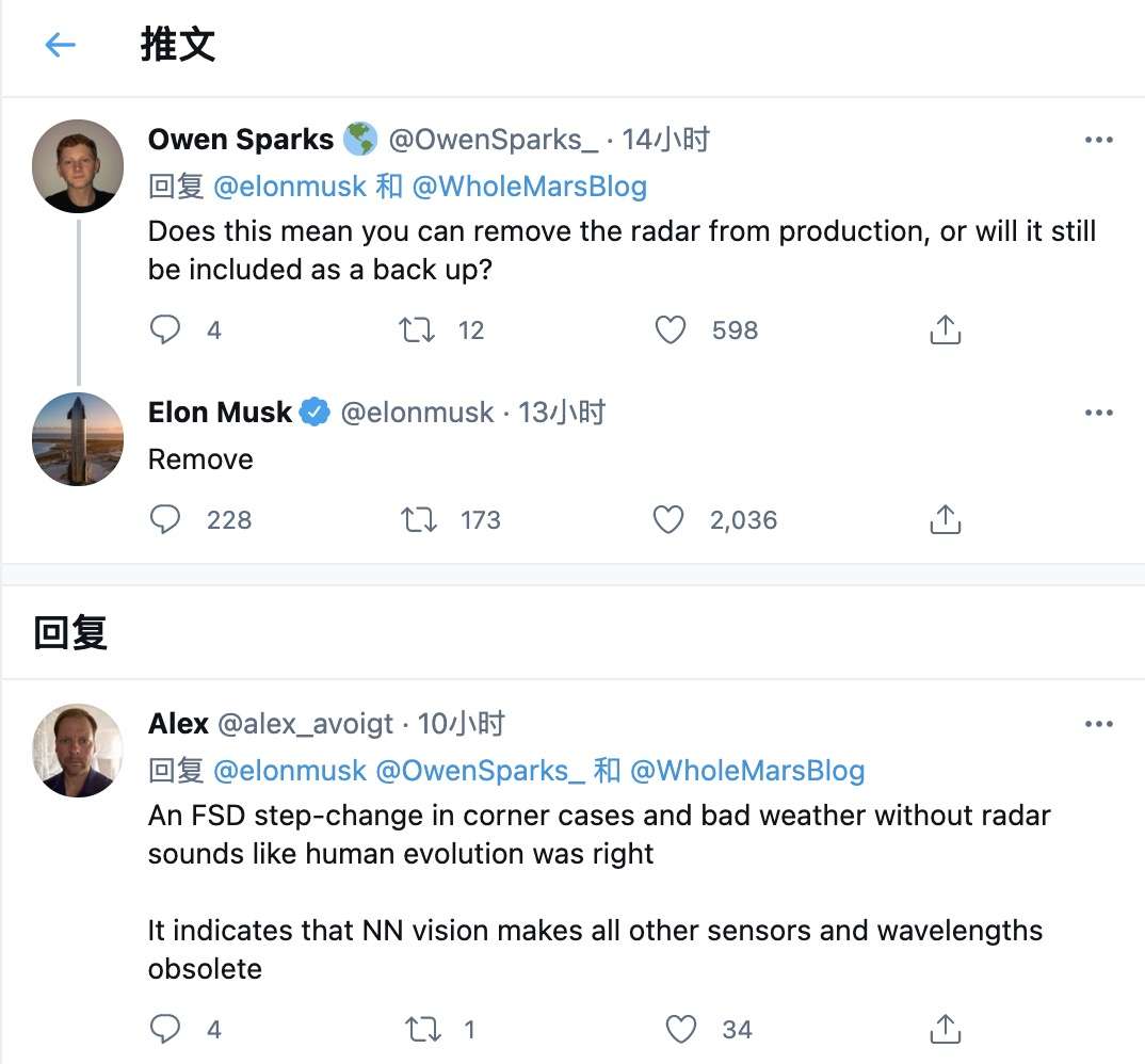 马斯克在推特说,会在未来量产车上移除毫米波雷达。