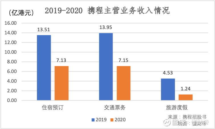 详细拆解业绩,携程旗下 “住宿预订” 和 “交通票务” 两大主营业务占总营收比接近 80%。2019 年,两项业务合计营收接近 28 亿港元。但 2020 年,其营收规模近乎腰斩。