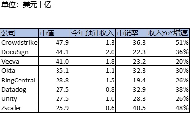 横向对比 500 亿市值以下的 SaaS 公司 P/S 市销率(Bloomberg 数据):