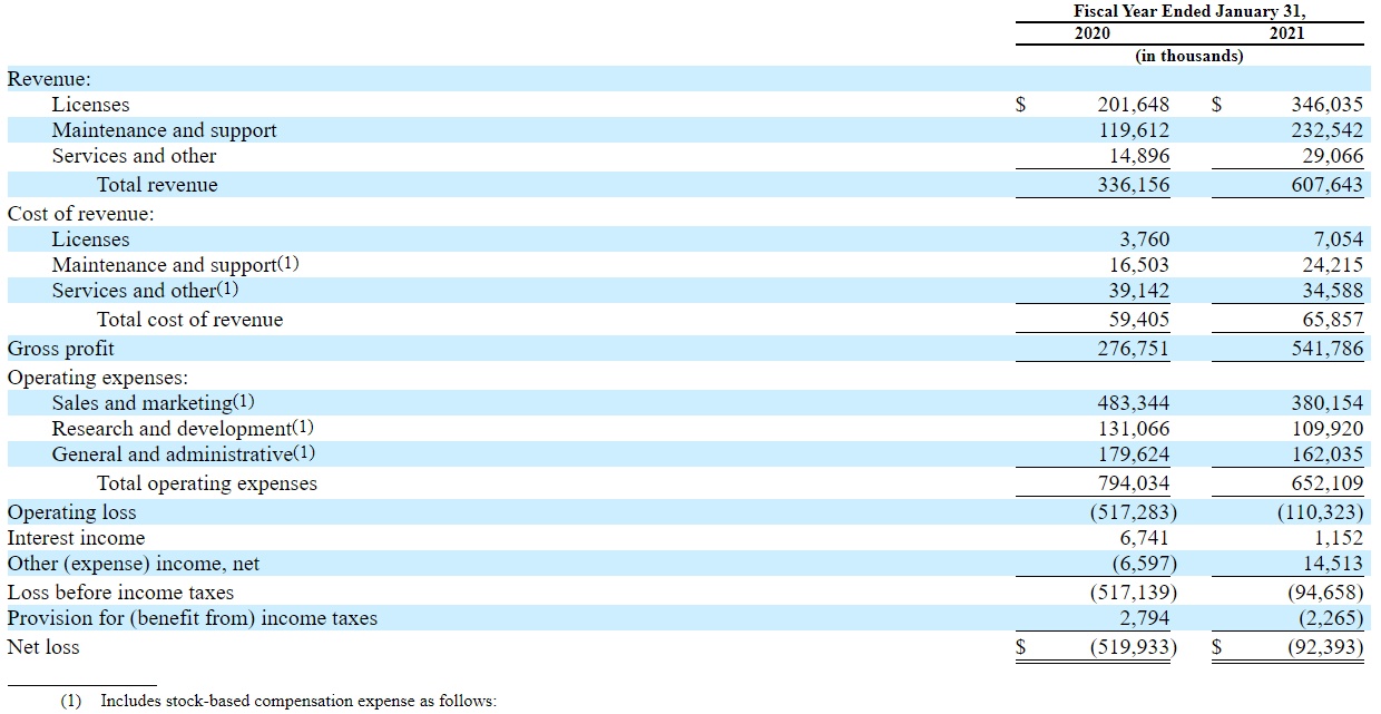 2020 财年底公司有 597 名客户的 ARR 达到 10 万美元,43 名客户达到 100 万美元,到 2021 年时已有 1002 名客户 ARR 达到 10 万美元,89 名客户达到 100 万美元。