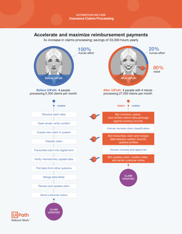 上图右侧给这四个员工每人配一个 UiPath 机器人上述链条的 80% 工作,人工 20% 的工作只需要检阅。新工作流程每个月可以处理 27000 个索赔,每年帮该公司节省 33000 小时。假设公司人工 15 美元/小时,每年节约 49.5 万美元。