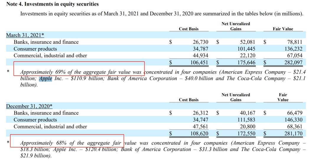 其中,4 家合计占整体股票持仓的 69%,而苹果 1 家的占比就接近 40%:
